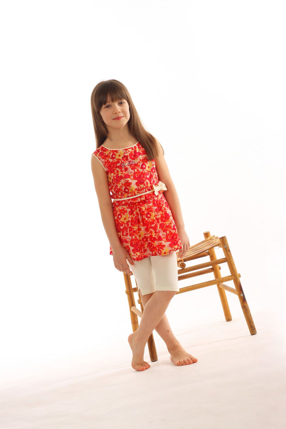 Блузка для девочки на лето, выполнена из высококачественного хлопка. Декорирована регулируемым поясом-рюшей, бантиком и стразами.