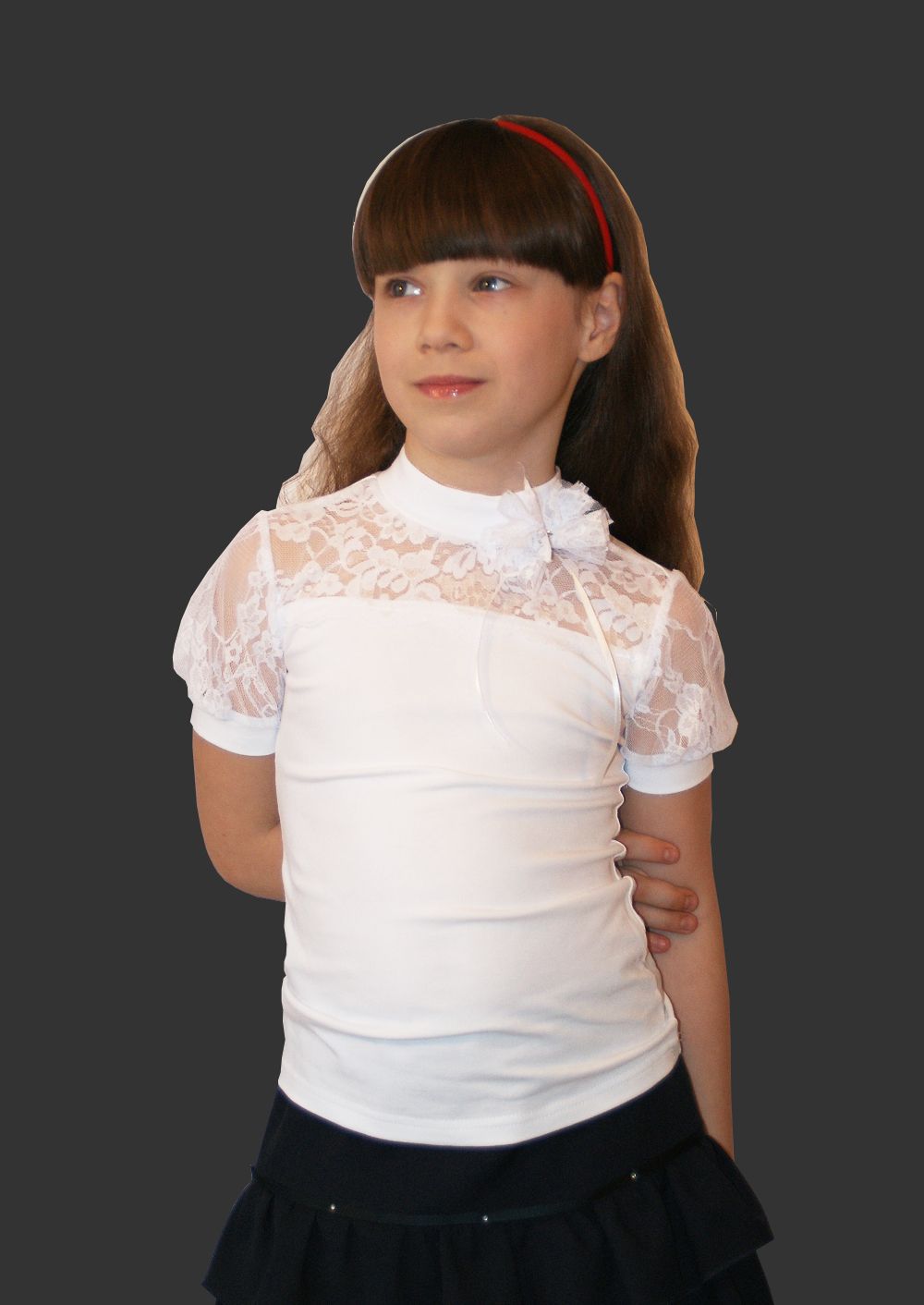 Блузка нарядная для школы из мягкого трикотажа, кокетка из кружева. Украшена блузка стразами и кружевным цветком.