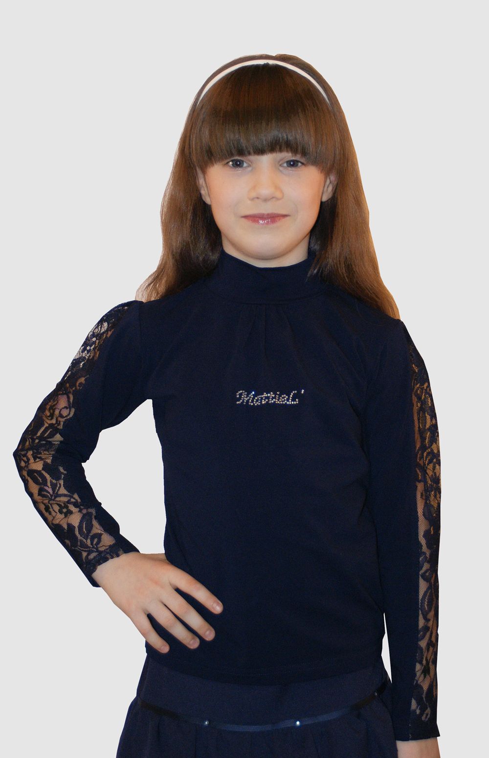 Блузка нарядная для школы. Блузка на девочку из трикотажа (кулирка качество пенье) комбинирована с кружевом, украшена стразами. Блузка удобна для школы и торжественных случаев.