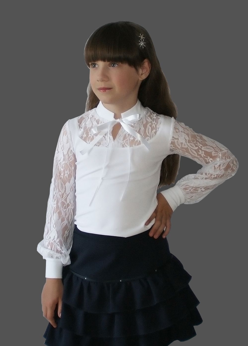 Блузка нарядная из трикотажа и кружева. Воротник стойка с завязкой на ленточки.