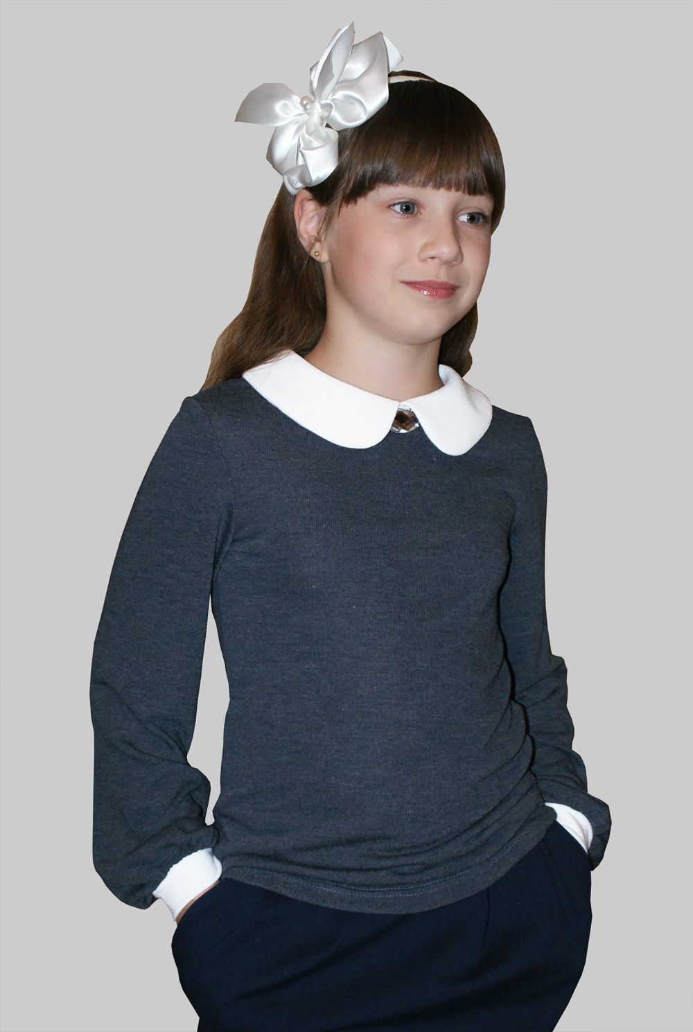 Блузка из мягкого трикотажа, с длинным рукавом. Воротник отложной украшен кристалом. На спинке шов с застежкой на пуговицу. Удобный силуэт позволит комфортно себя чувствовать. Можно использовать как для торжественного случая так и на каждый день.